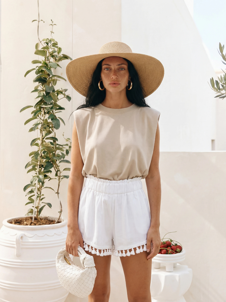 The oversized Leonardo blouse is a model that will work perfectly with the trousers of the same name. The round neckline adds a classic accent. There is a subtle slit fastened with a button at the back. Polish manufacturer Cocomore. The product presentation features AI-generated visuals.