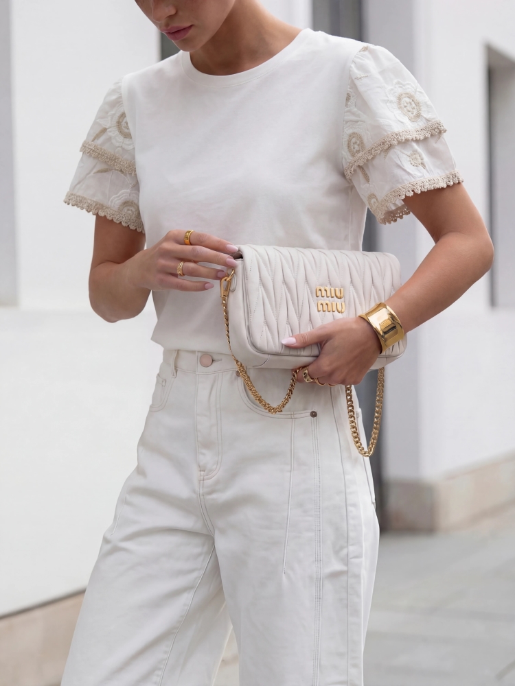The Evaner T-shirt is a cotton-elastane model with a timeless cut. Its shirt sleeves, adorned with lace appliqués, add a touch of chic and elegance. It's an excellent base for many styles. The product presentation uses AI visualizations.