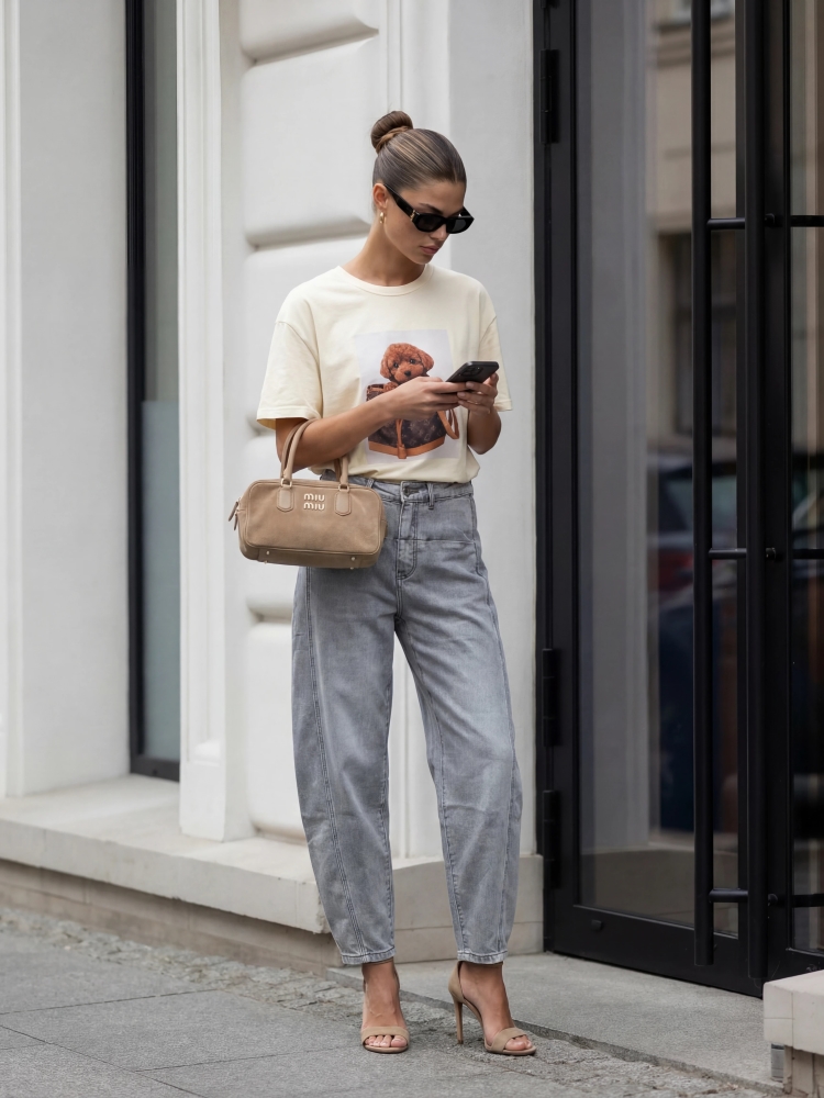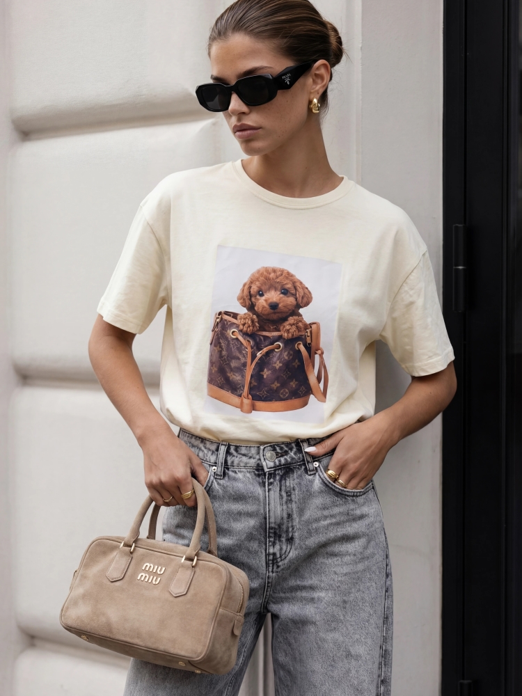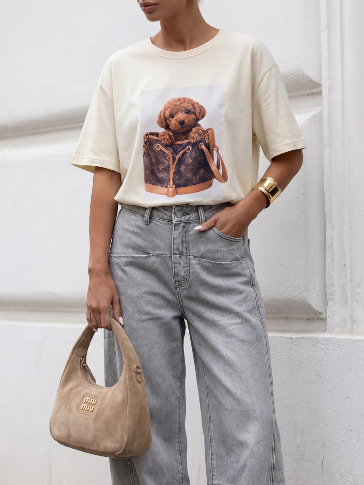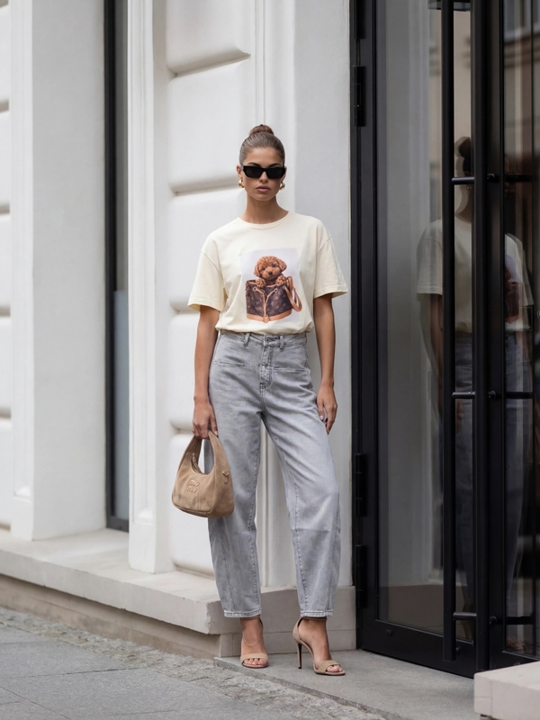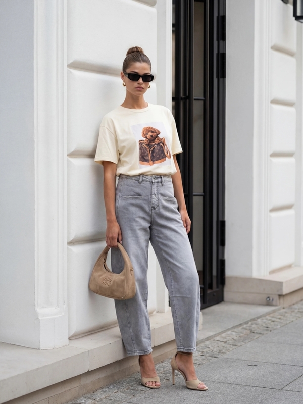 Millie's oversized T-shirt is made of high-quality, stretchy fabric. The front features an artistic print that breaks up the classic look. A round neckline completes the look. It's the perfect complement to any outfit. Produced in Poland by Cocomore. Product presentation uses AI visualizations.