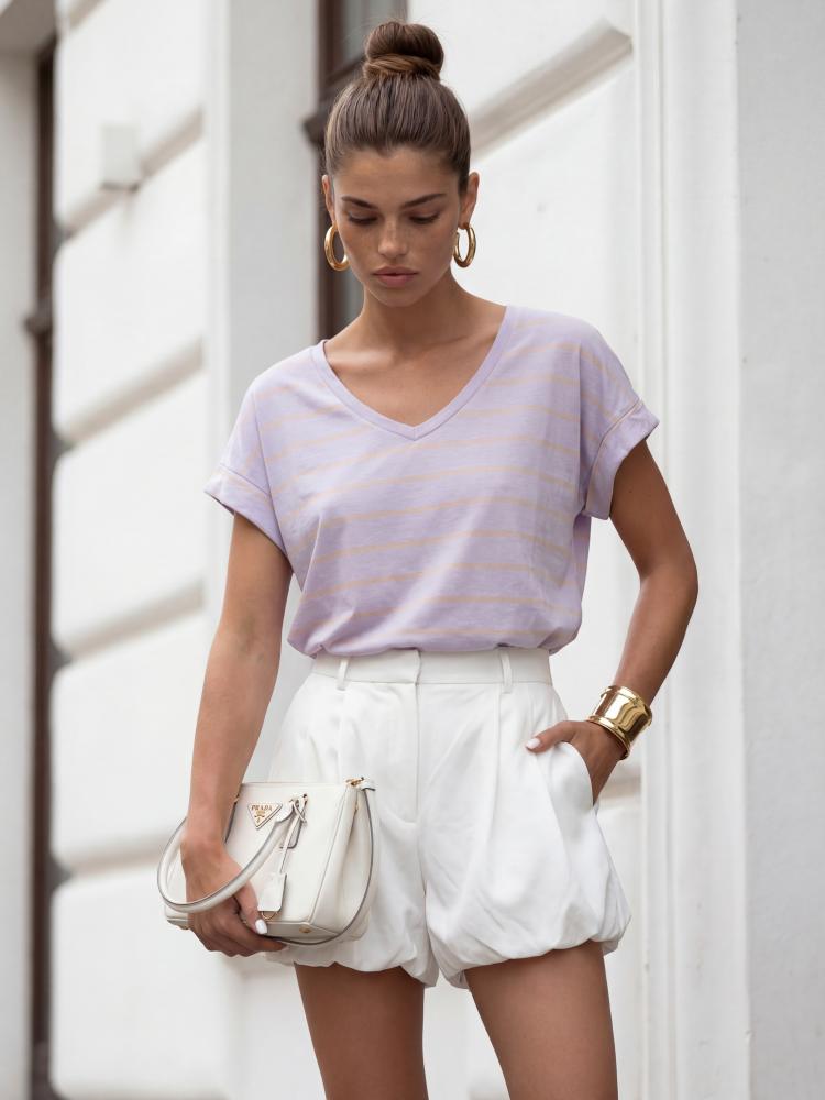 A fantastic, oversized Vikas T-shirt, made of high-quality material with a timeless striped print. It will perfectly complement any style. Made in Poland. Produced by Cocomore. Product presentation uses AI visualizations.