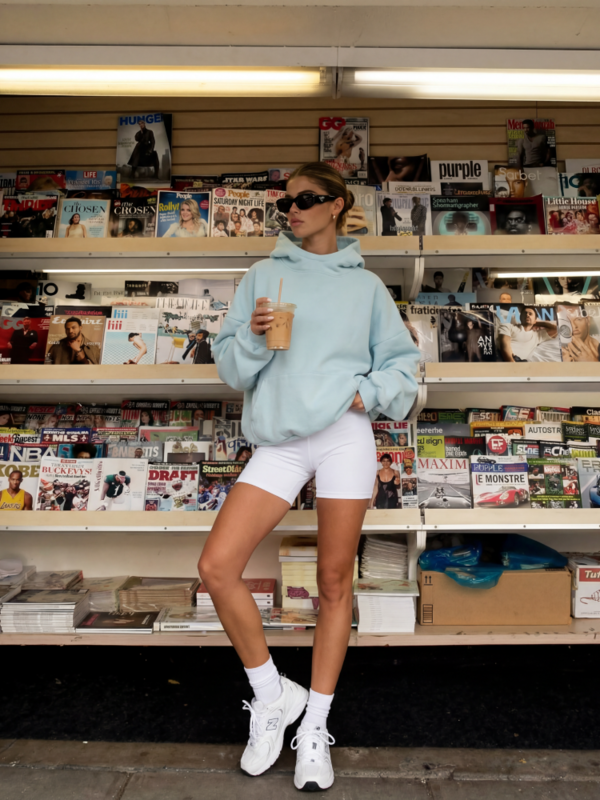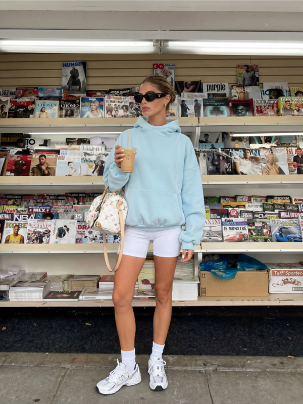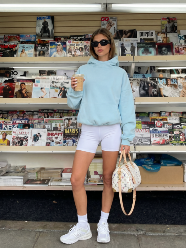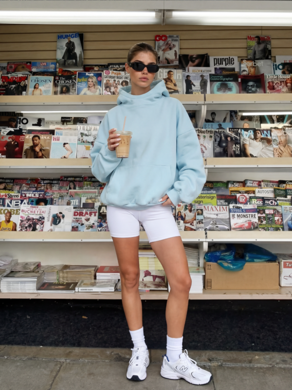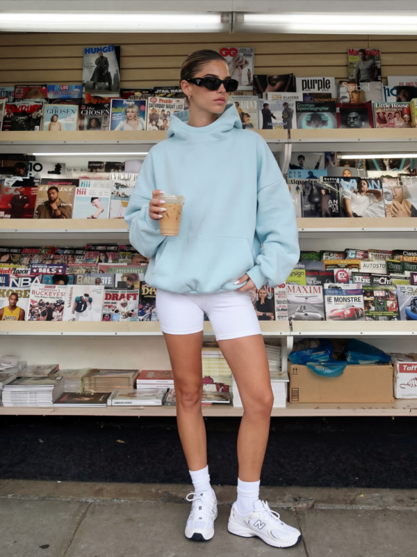 Efektowna, szeroka bluza Bridie , Wykonana z wysokiej jakości materiału. Na wykończeniach znajdują się praktyczne ściągacze. Dodatkowym atutem jest szeroki kaptur oraz kieszeń z przodu. Made in Poland. Producent Cocomore.  Prezentacja produktu wykorzystuje wizualizacje AI.