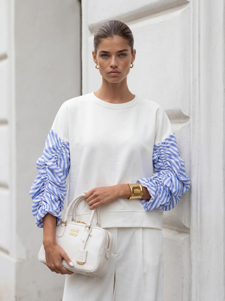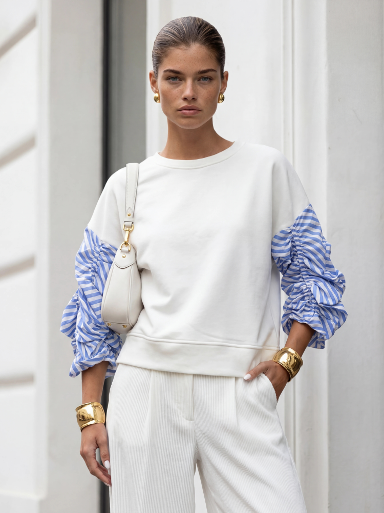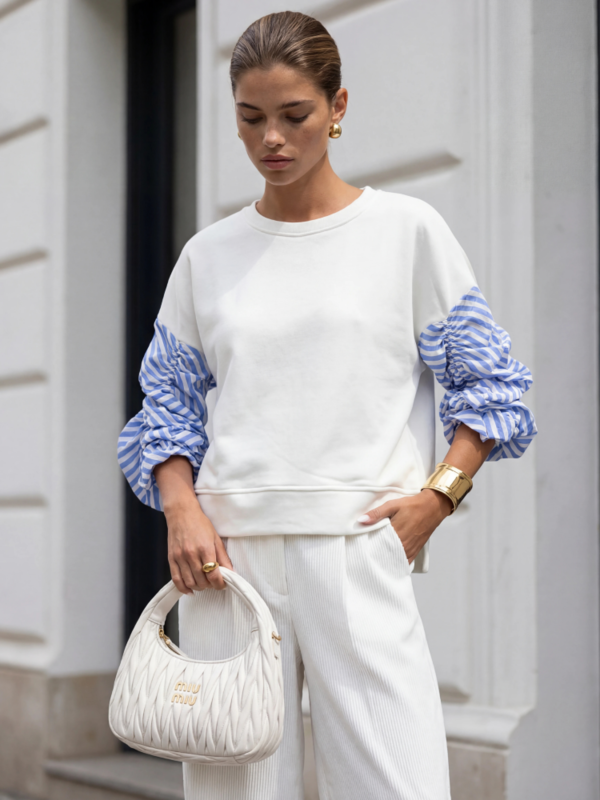 Bluza Elinoria to wyjątkowa propozycja dla kobiet ceniących sobie wygodę i stylowy wygląd. Charakteryzuje się luźnym krojem, który zapewnia pełną swobodę ruchów. Okrągły dekolt dodaje jej elegancji. Rękawy został wykonane z kontrastującego, koszulowego materiału, co dodaje bluzie lekkości i dziewczęcego uroku. Wykończenie rękawów ściągaczami pozwala na idealne dopasowanie do ciała. Polski producent Cocomore. Prezentacja produktu wykorzystuje wizualizacje AI.