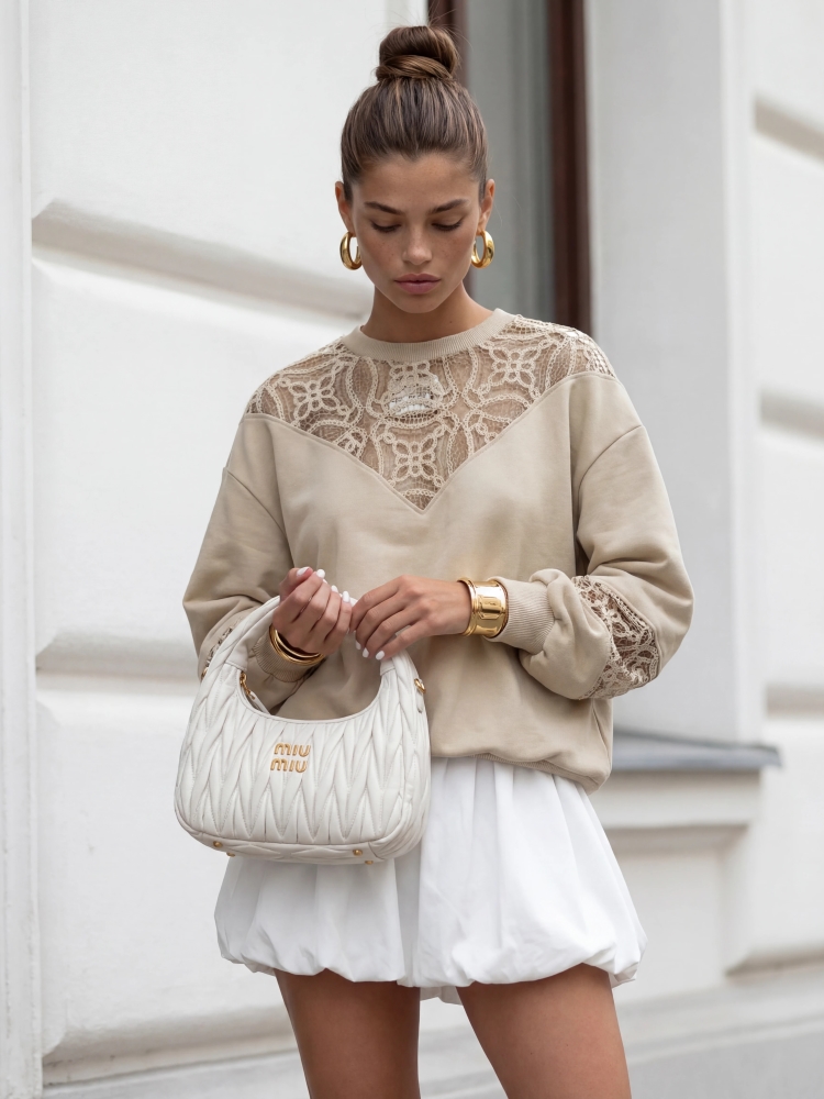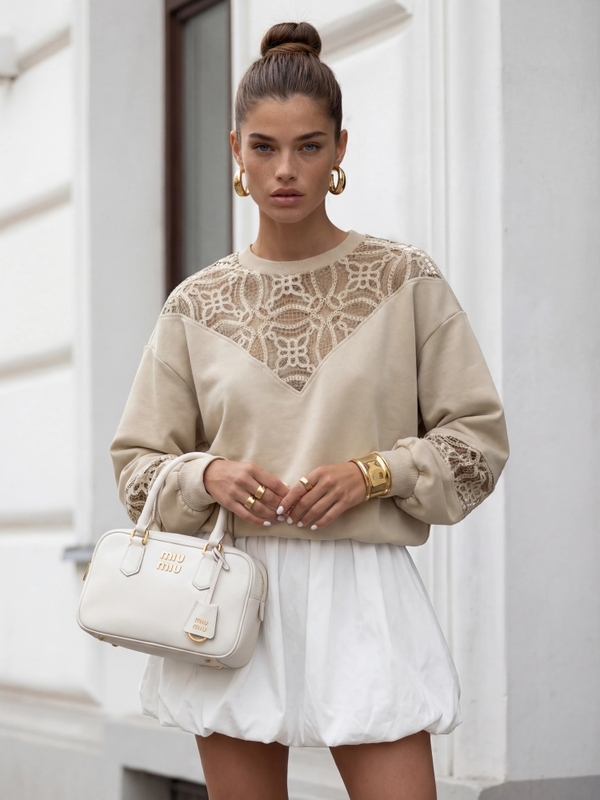 Stylowa bluza Etta, wykonana z wysokiej jakości materiału. Fason urozmaicają koronkowe, półprzezroczyste wstawki. Ściągacze na wykończeniach dodają jej praktyczności. Idealna jako dopełnienie codziennych stylizacji. Polski producent Cocomore. Prezentacja produktu wykorzystuje wizualizacje AI.