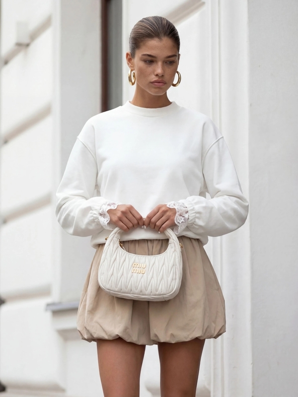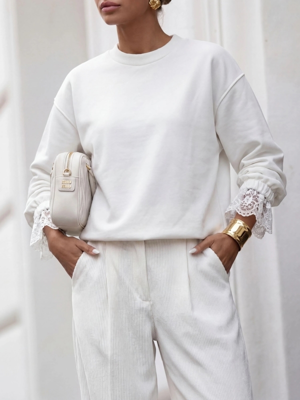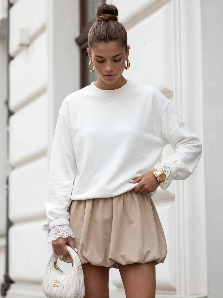 Niezwykle urocza bluza Minnie, wykonana z dzianinowego materiału, który zapewni komfort noszenia. Oversize'owy krój równoważą ściągacze na wykończeniach. Dodatkowo, rękawy zdobią koronkowe mankiety, które nadają jej niepowtarzalnego szyku i elegancji. Polski producent Cocomore. Prezentacja produktu wykorzystuje wizualizacje AI.