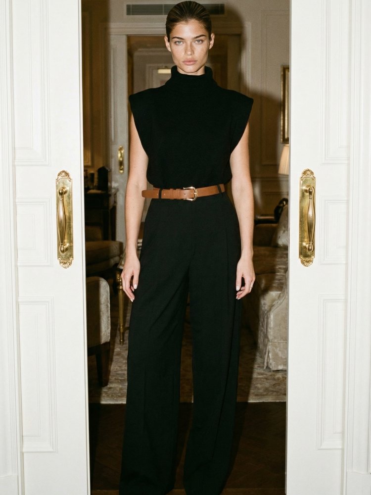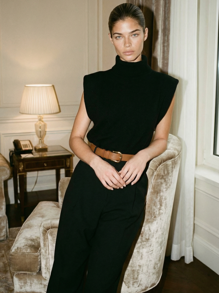 Kombinezon Arpan to połączenie klasy z komfortowym lookiem. Sweterkową górę z półgolfem wieńczy subtelne rozcięcie na karku, zapinane na guziki oraz ekspres. Poduszki na ramionach zapewnią idealne ułożenie na sylwetce. Po bokacha znajdują się pojemne kieszenie. Dodatkowo, w talii znajdują się zakładki oraz kontrastujący pasek. Polski producent Cocomore.