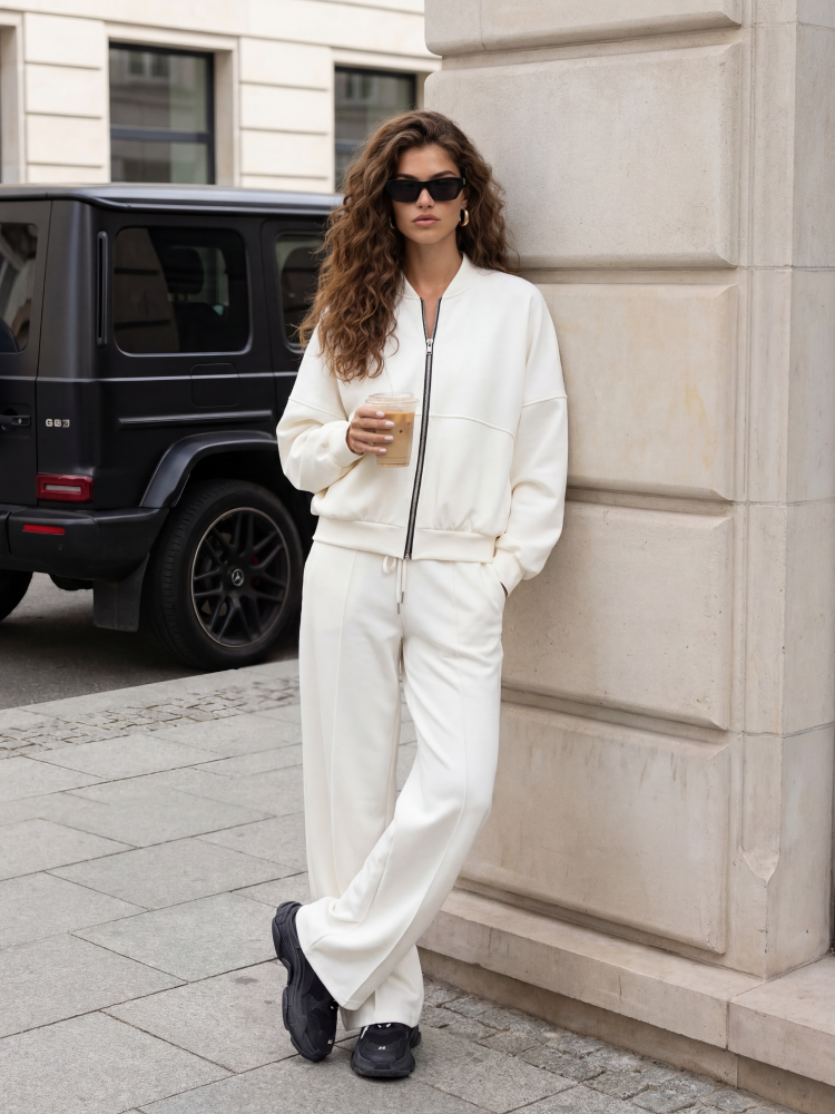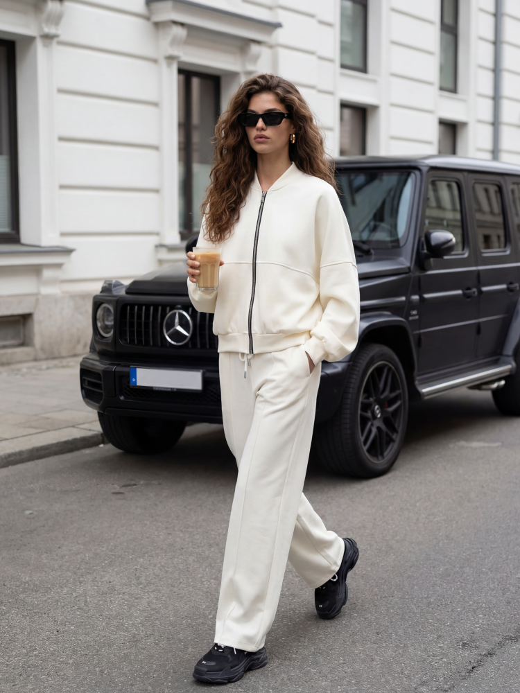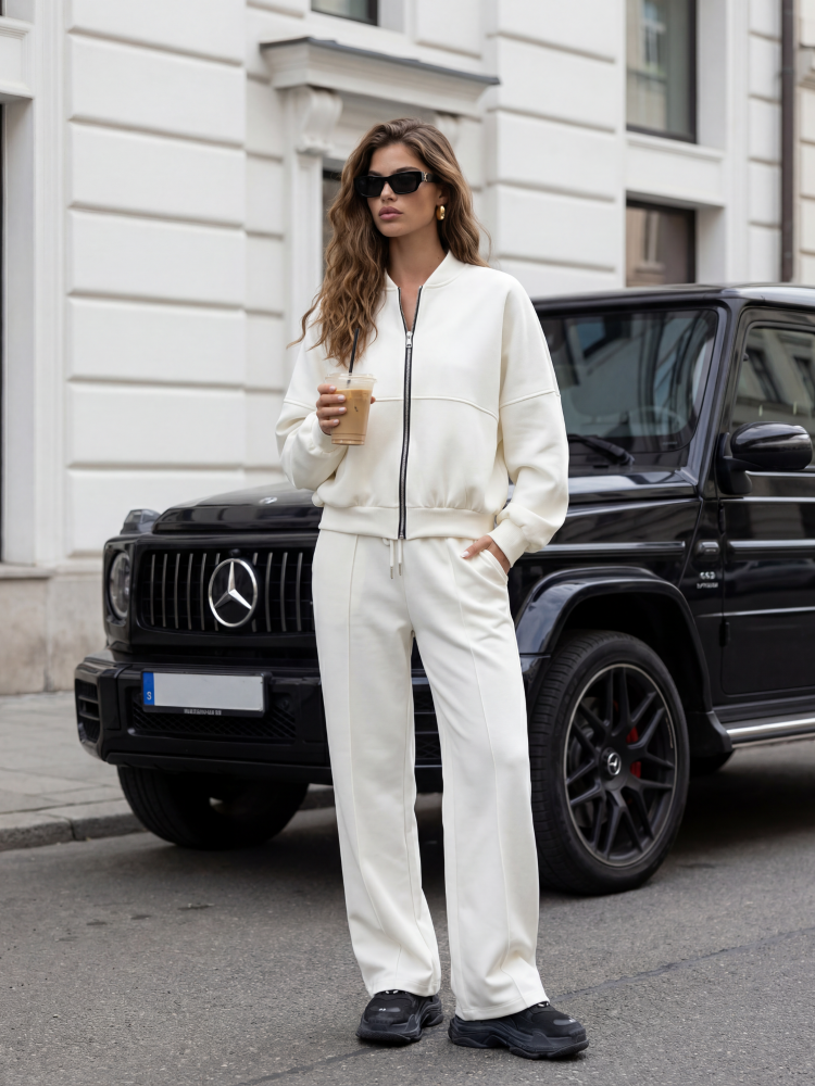 Komplet Floy to dresowy zestaw o luxnym kroju. Bluza zapinana na ekspres z ozdobnymi przeszyciami oraz ściąaczami na wykończeniach. Zapinana na ekspres. Dół stanowią spodnie z szerokimi nogawkami z podłużnymi przeszyciami. W talii znajduje się szeroki ściągacz uzupełniony wiązaniem, który uwydatni talię. Po bokach znajdują się kieszenie. Całość tworzy spójny komplet, który sprawdzi się w wielu sytuacjach. Produkt z importu. Prezentacja produktu wykorzystuje wizualizacje AI.