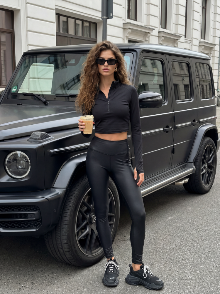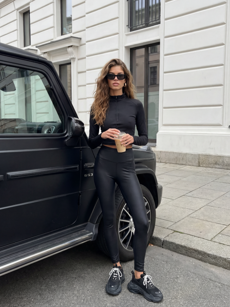 Komplet Melvis to sportowy zestaw o mocno przylegającym kroju. Bluza zapinana na ekspres z dekoltem regulowanym za pomocą ekspresu. Dół stanowią dopasowane legginsy. W talii znajduje się szeroki pas, który uwydatni talię. Całość tworzy spójny komplet, który sprawdzi się w wielu sytuacjach. Produkt z importu. Prezentacja produktu wykorzystuje wizualizacje AI.