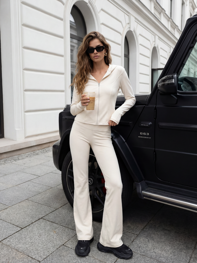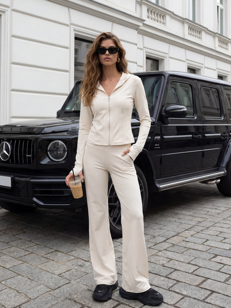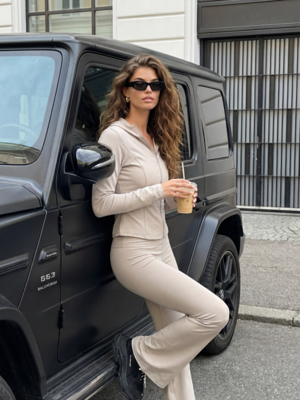 Komplet Tenner to sportowy zestaw o mocno przylegającym kroju. Bluza zapinana na ekspres z ozdobnymi przeszyciami oraz kapturem. Zapinana na ekspres. Dół stanowią spodnie z rozszerzanymi nogawkami. W talii znajduje się szeroki pas, który uwydatni talię. Całość tworzy spójny komplet, który sprawdzi się w wielu sytuacjach. Produkt z importu. Prezentacja produktu wykorzystuje wizualizacje AI.