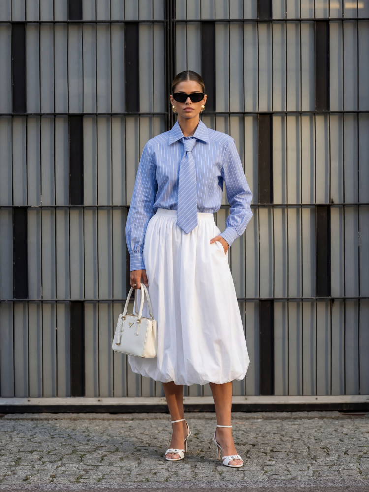 Koszula Laura to model o rozszerzanym kroju z poduszkami na ramionach. Zapinana na guziki. Klasyczny krój gwarantuje idealny wygląd. Znakomicie sprawdzi się jako baza do wielu stylizacji, które możemy uzupełnić krawatem dołączonym do koszuli. Całość wieńczą bufiaste rękawy, wykończone mankietami zzapinanymi na dwurzędowe guziki.  Polski producent Cocomore. Prezentacja produktu wykorzystuje wizualizacje AI.