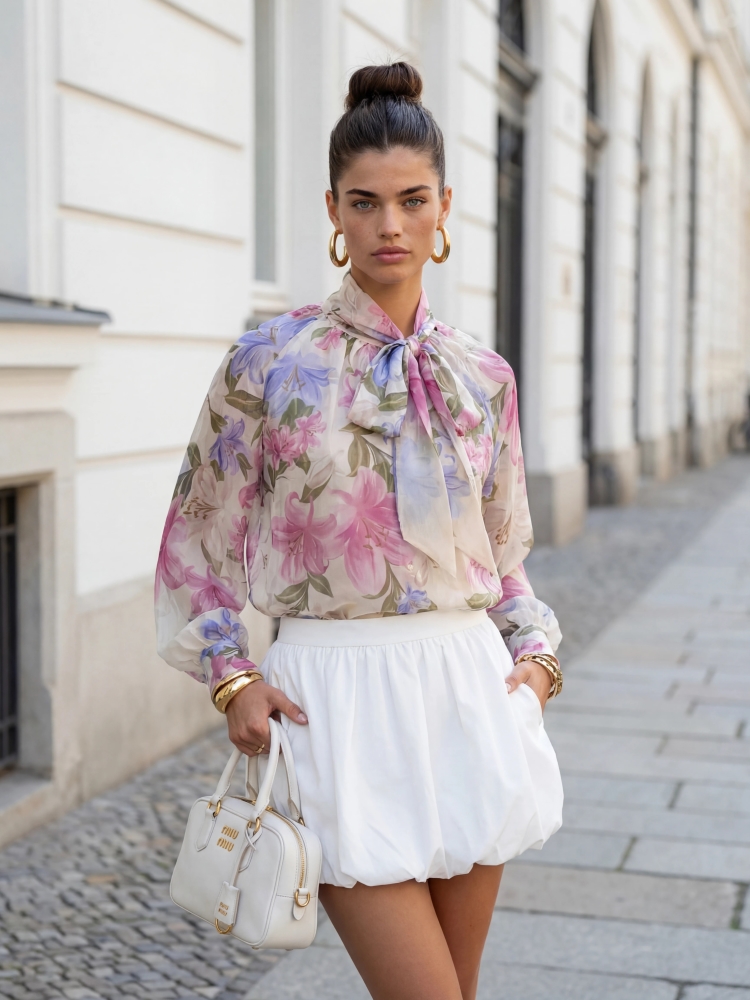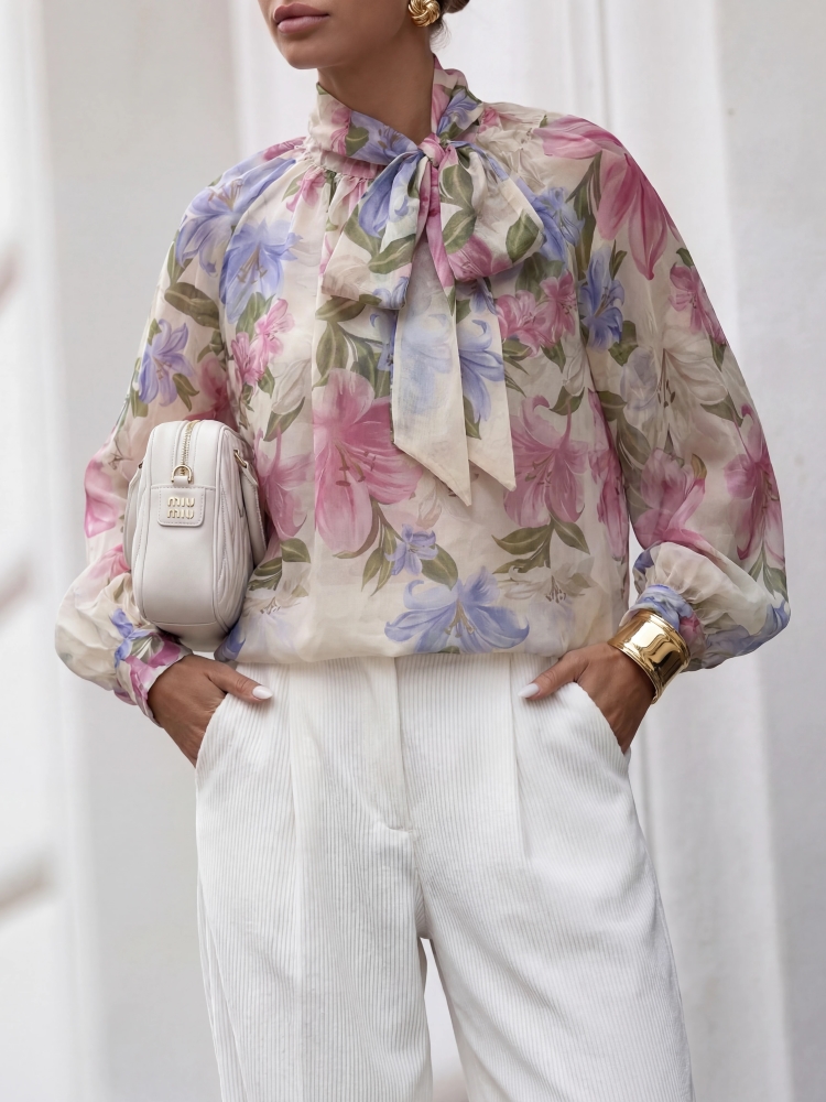 Koszula Rosemary to zachwycający model, wykonany z półprzezroczystego materiału. Bufiaste rękawy równoważą mankiety zapinane na dwurzędowe guziki. Elegancji dodaje jej wiązanie pod szyją, które możemy dopasować do własnych preferencji. Znakomicie sprawdzi się jako uzupełnienie wiosenno-letnich stylizacji. Prezentacja produktu wykorzystuje wizualizacje AI.