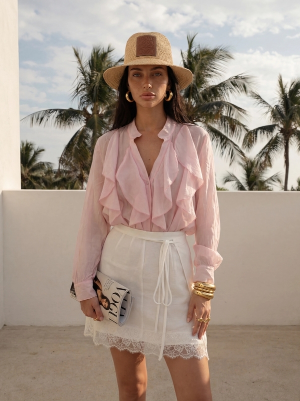 Wysokiej jakości koszula Yvonne to model, który z powodzeniem uzupełni wiele stylizacji. Oversize'owy krój zapewni komfort i swobodę noszenia. Zapinana na praktyczne guziki. Szyku i elegancji dodają falbany zdobiące przód. Polski producent Cocomore. Prezentacja produktu wykorzystuje wizualizacje AI.