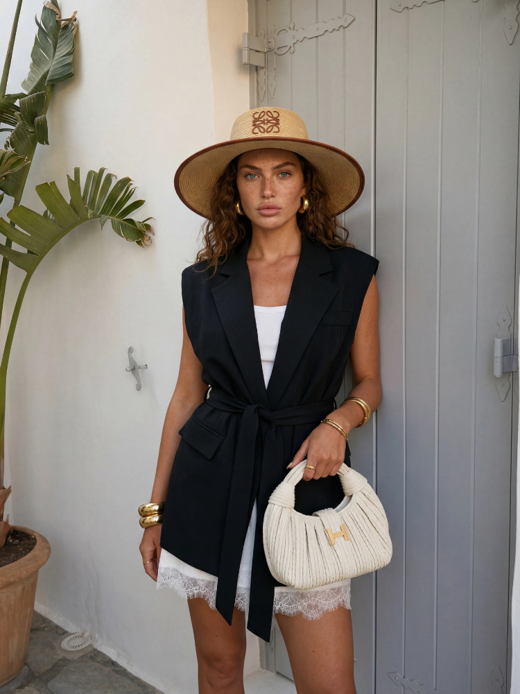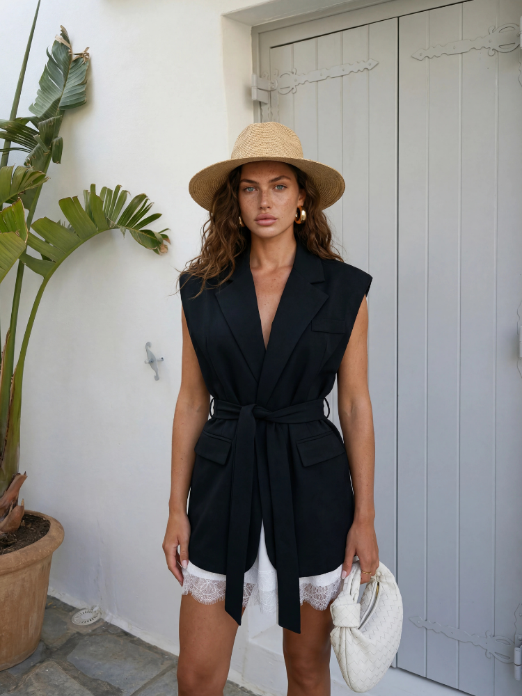 Kamizelka Magnolia to idealny wybór dla osób ceniących sobie niebanalne rozwiązania. Posiada oversize'owy krój oraz szeroki kołnierzyk. Z przodu umiejscowione są imitacje kieszeni z klapami. W talii wiązana jest materiałowym paskiem. Posiada podszewkę oraz poduszki na ramionach. Polski producent Cocomore.