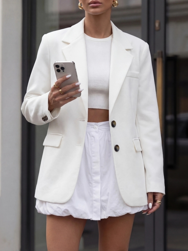 Genialna marynarka Aurelia, to efektowna propozycja z praktyczną podszewką oraz poduszkami na ramionach. Zapinana na dwurzędowe guziki. Z przodu umiejscowione są imitacje kieszeni. Dodatkowo, z tyłu na dole znajduje się rozcięcie. Rękawy wieńczą guziki. Polski producent Cocomore. Prezentacja produktu wykorzystuje wizualizacje AI.