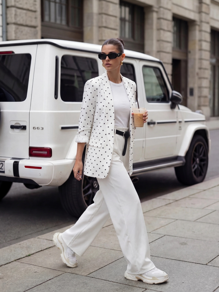 Marynarka Dilmona Dots to fason o taliowanym kroju. Wykonana z wysokiej jakości materiału w uroczy print. Po bokach umiejscowione są imitacje kieszeni. Całość dopełniają poduszki na ramionach oraz podszewka, które zagwarantują idealne ułożenie na sylwetce. Prezentacja produktu wykorzystuje wizualizacje AI.