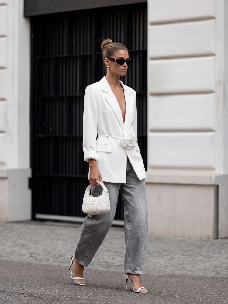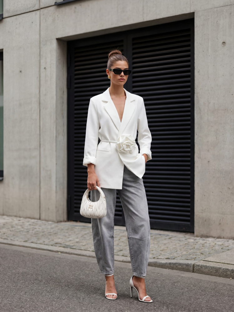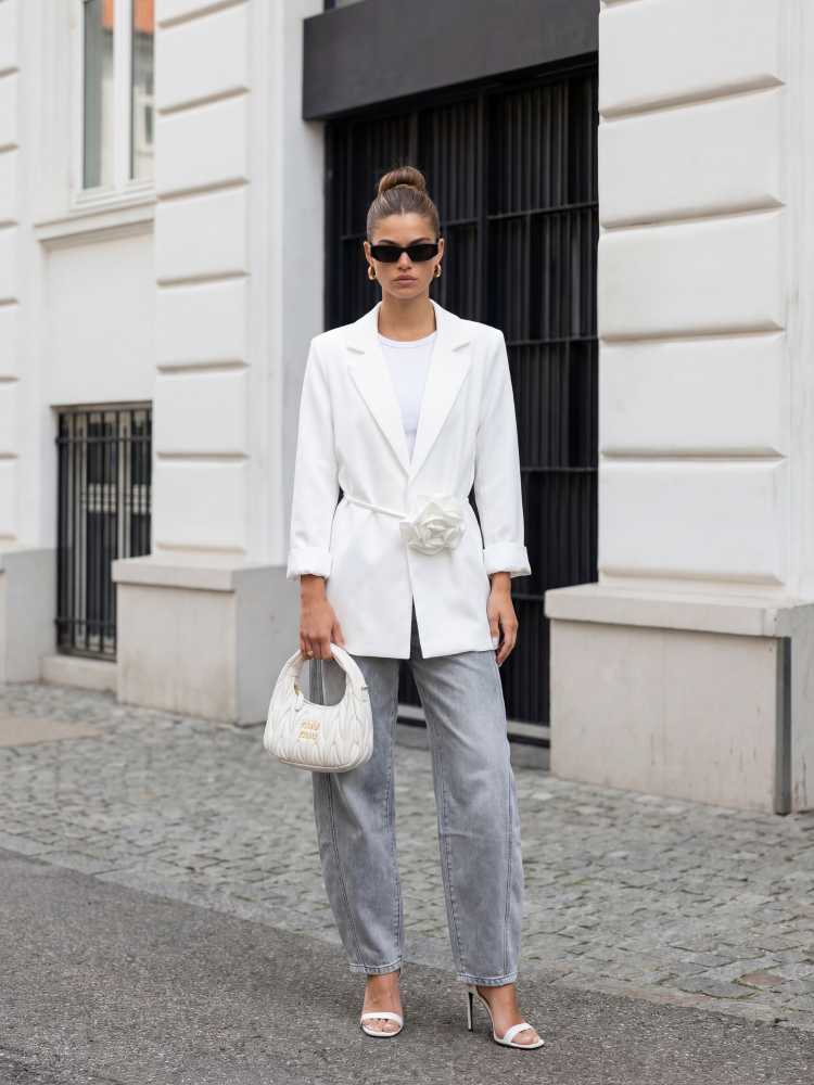 Genialna marynarka Emanuela a to obowiązkowy model w każdej szafie. Podszewka oraz poduszki na ramionach zapewnią idealne ułożenie na sylwetce. W talii umiejscowione są szlufki, które możemy wykorzystać do regulacji szerokości za pomocą materiałowego paska. Pasek zdobi kwiecista broszka, którą możemy ozdobić marynarkę według własnych preferencji. Prezentacja produktu wykorzystuje wizualizacje AI.
