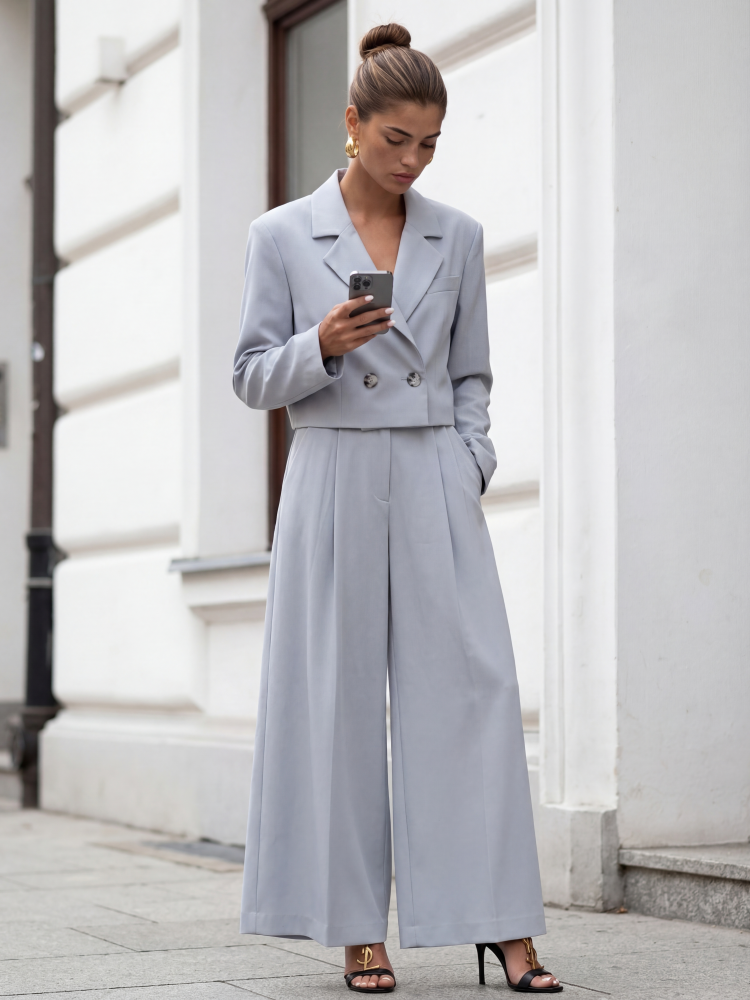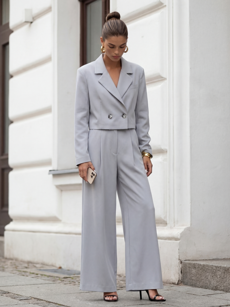 Marynarka Millis o krótkim, oversize'owym kroju. Posiada podszewkę, poduszki na ramionach oraz szeroki kołnierzyk, który świetnie dopełnia całość. Zapinana na dwurzędowe guziki. Z przodu znajdują się imitacja kieszeni. Rękaw zdobi rozcięcie oraz guziki. Skompletuj ze spodniami o tej samej nazwie i stwórz niezwykle elegancką stylizację. Polski producent Cocmore. Prezentacja produktu wykorzystuje wizualizacje AI.