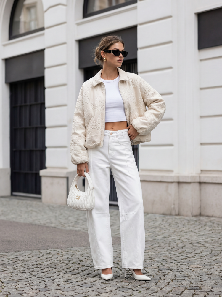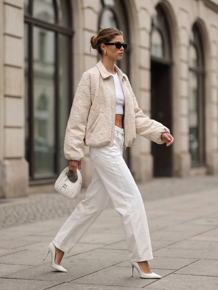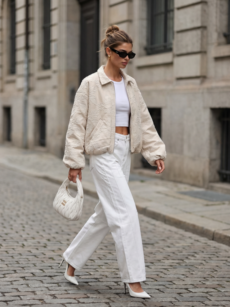 Kurtka Edwina o kroju bomberki  to połączenie elegancji z dodatkiem sportowego charakteru. Dół wykończony jest praktycznym ściągaczem, dzięki któremu kurtka świetnie dopasuje się do sylwetki. Zapinana na ekspres. Rękawy zdobią ściągacze. Podszewka zapewni komfort podczas noszenia. Całość dopełniają niezwykle urocze, hafotwane kwiaty. Prezentacja produktu wykorzystuje wizualizacje AI.