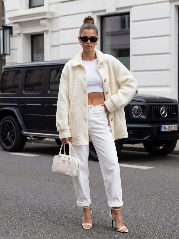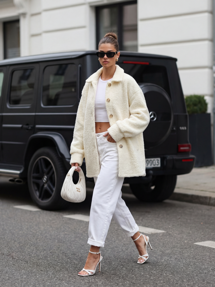 Kurtka Erma to model o koszulowym kroju, wykonany z materiały typu boucla. Wydłużony krój zapewni komfort noszenia oraz wiele możliwości stylizacji. Zapinana na praktyczne guziki. Po bokach umiejscowione są pojemne kieszenie. Prezentacja produktu wykorzystuje wizualizacje AI.
