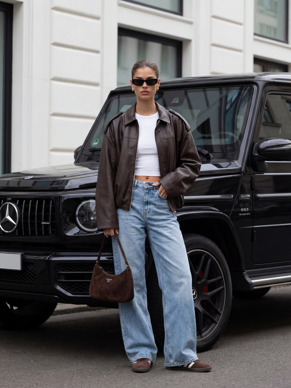 Kurtka Rolanda to elegancka ramoneska wykonana z eko-skóry. Zapinana na praktyczny ekspres. Przód zdobią ozdobne przeszycia, a ramiona ozdobne pagony. Polski producent Cocomore. Prezentacja produktu wykorzystuje wizualizacje AI.