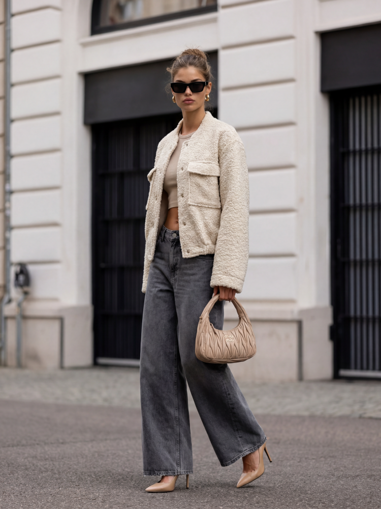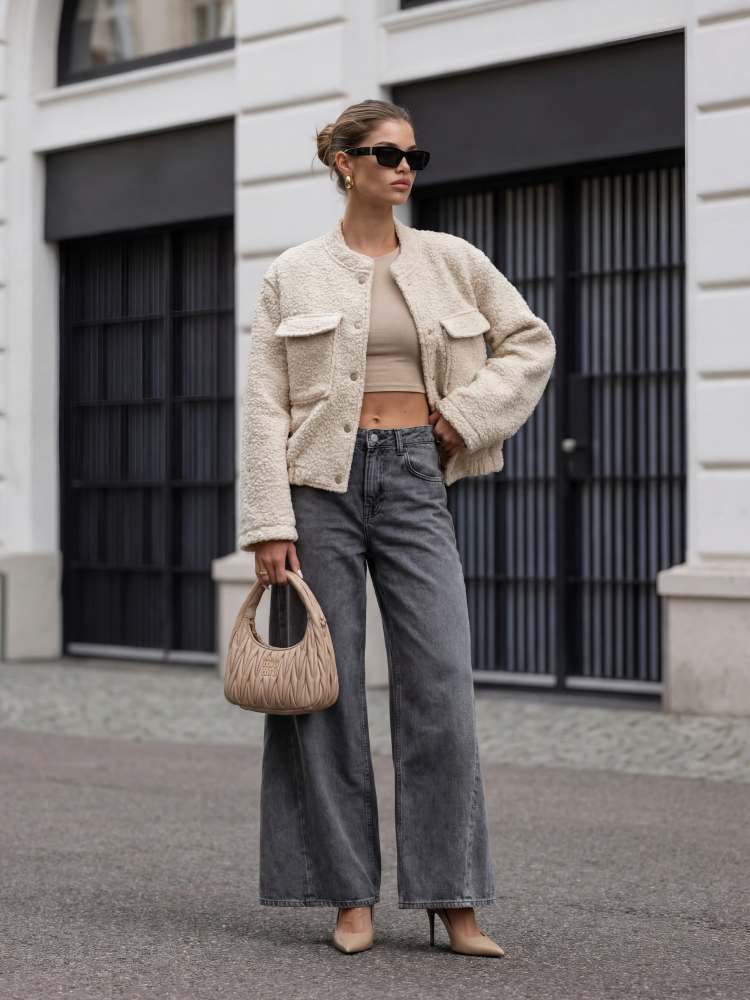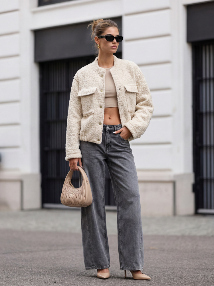 Unikatowa kurtka Sherine , wykonana z ultra miłego materiału typu boucla. Luźny krój zapewnia komfort i wygodę. Po bokach znajdują się pojemne kieszenie z klapami. Dodatkowym atutem są kontrastujące, metalowe guziki. Dół zdobi ściągacz, który zagwarantuje dopasowanie do sylwetki. Prezentacja produktu wykorzystuje wizualizacje AI.