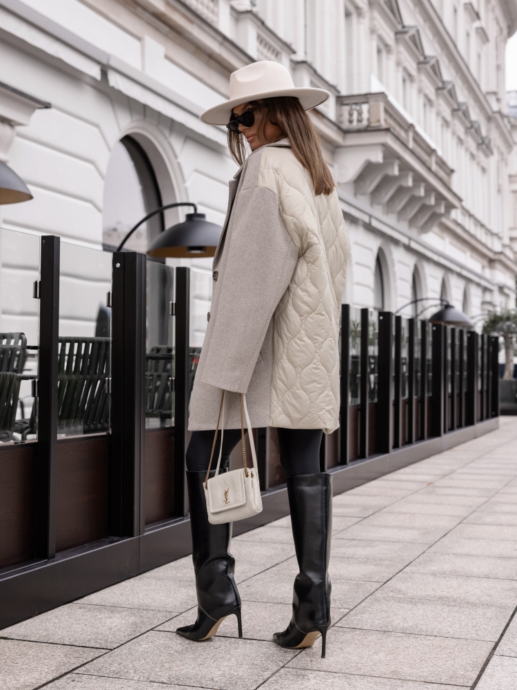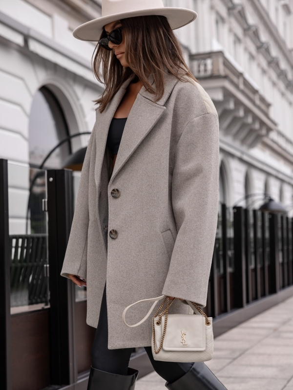 Elegancki, oversie'owy płaszcz Donald, wykonany z wysokiej jakości materiału. Łączy w sobie elegancję ze sportową nutą. Pod spodem znajduje się podszewka. Zapinany na guziki. Dodatkowym atutem jest szeroki kołnierz oraz trapezowy krój. Po bokach znajdują się praktyczne kieszenie. Tył natomiast, wykonany jest z kontrastującego, pikowanego materiału. Polski producent Cocomore.