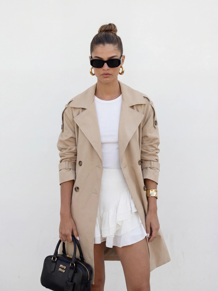 Fantastyczny płaszcz Joplin to obowiązkowa pozycja w każdje szafie. Szeroki krój możemy równoważyć, dzięki wiązaniu za pomocą materiałowego paska w talii. Zapinany na dwurzędowe guziki, które dodają mu wdzięku. Po bokach umiejscowione są praktyczne kieszenie. Ramiona zdobią naszyte pagony. Podszewka zagwarantuje idealne ułożenie na sylwetce. Prezentacja produktu wykorzystuje wizualizacje AI.