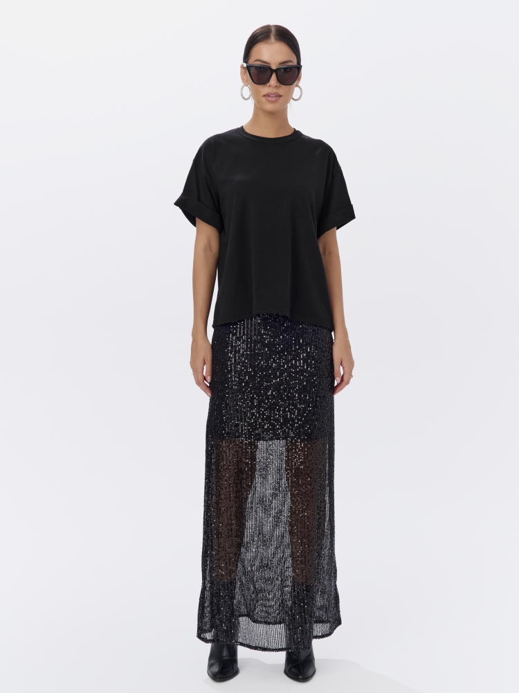 Efektowna, cekinowa spódnica Elisabeth o długości maxi. Wykonana z wysokiej jakości materiału. U góry znajduje się praktyczny ściągacz. Całość dopełnia podszewka. Polski producent Cocomore.