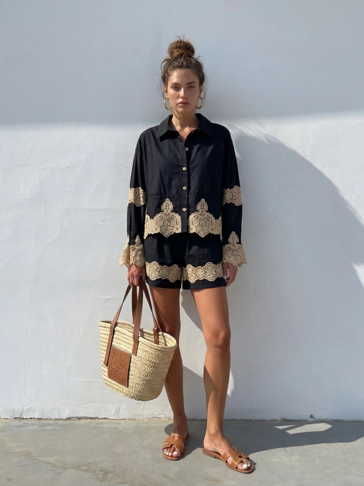 Urocze spodenki Arlyn, wykonane z bawełnianego materiału, który zapewni komfort noszenia. Wysoki stan dopełniony został gumką w talii, która uwydatni sylwetkę. Całość urozmaicają niepowtarzalne, haftowane detale. Wystylizuj z koszulą o tej samej nazwie. Polski producent Cocomore. Prezentacja produktu wykorzystuje wizualizacje AI.