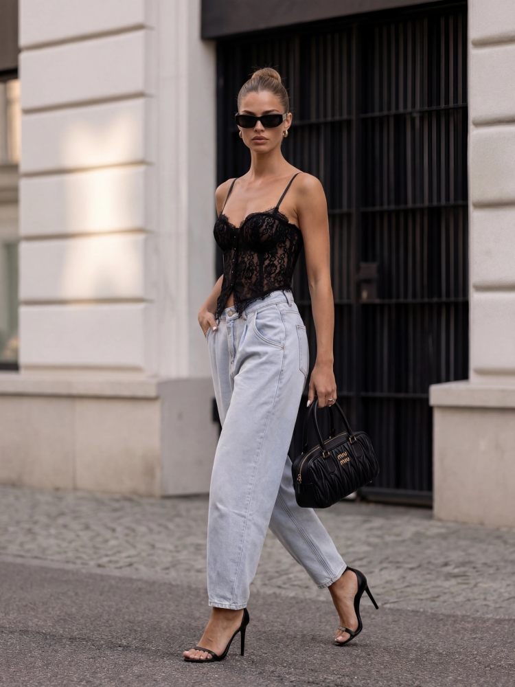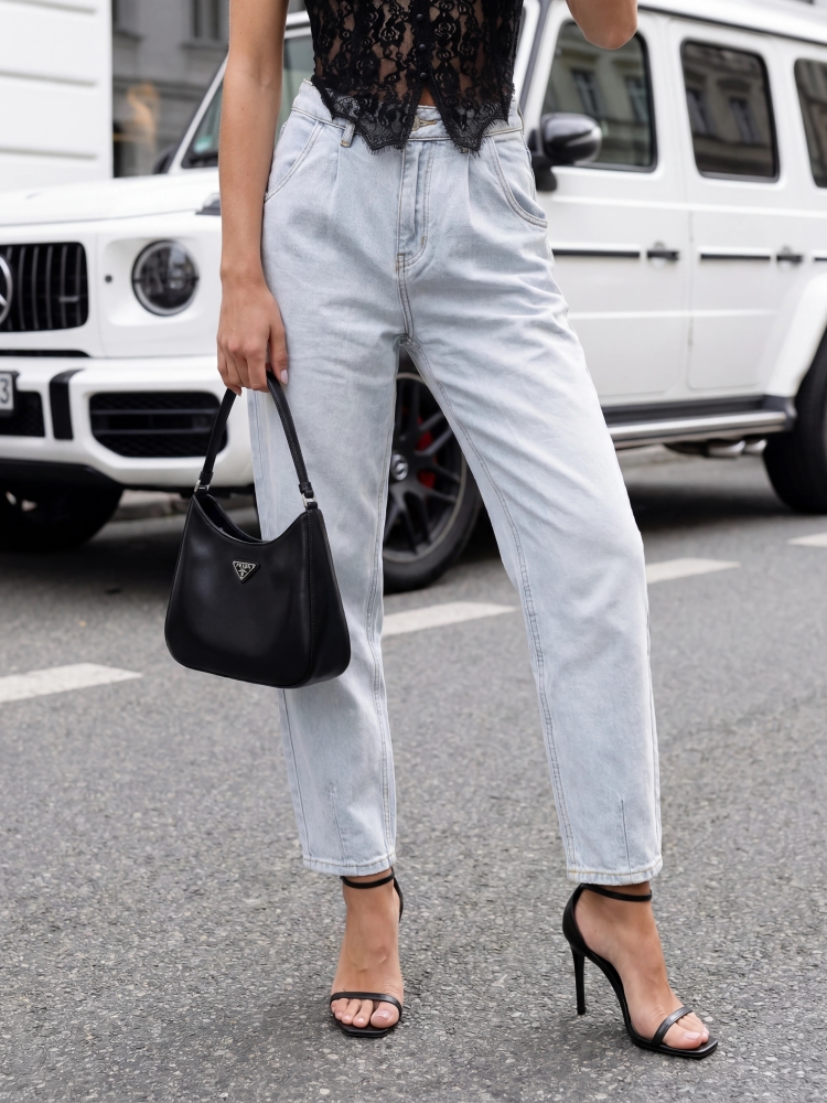 Jeansowe spodnie August o kroju baloon, to najmodniejsza propozycja w tym sezonie. Zapinane na praktyczny ekspres i guzik. Posiadają liczne kieszenie, a w talii szlufki. Wysoki stan znakomicie podkreśli talię. Produkt z importu. Prezentacja produktu wykorzystuje wizualizacje AI.