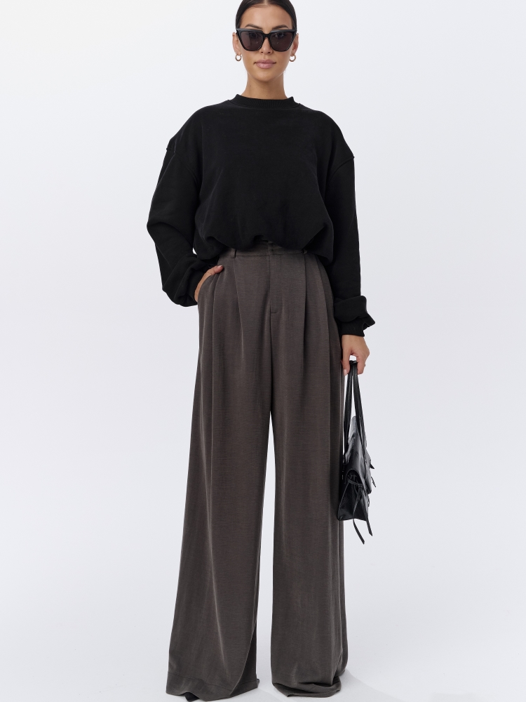 Luźno skrojone spodnie Daryl z rozszerzanymi nogawkami ku dołowi. Wysoki stan oraz zakładki wyeksponują talię. Zapinane na ekspres i dwurzędowe guzik, dodatkowo w talii umiejscowione są szlufki. Po bokach znajdują się praktyczne kieszenie. Polski producent Cocomore.