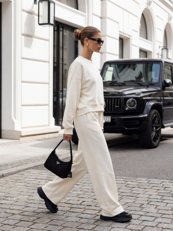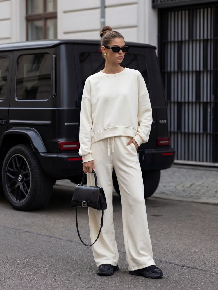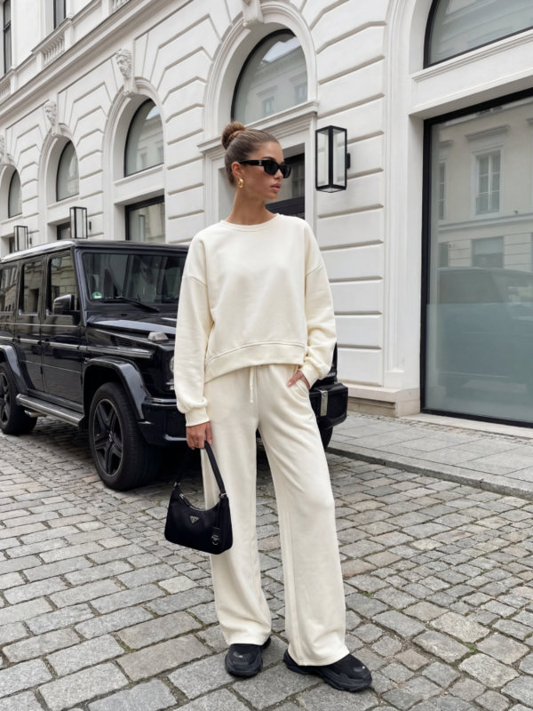 Dresowe spodnie Frieda to model o luźnym kroju, który zapewni komfort noszenia. Wysoki stan podkreśli sylwetkę. Dodatkowo, na górze znajduje się ściągacz dopełniony wiązaniem. Po bokach umiejscowione są praktyczne kieszenie. Wystylizuj z bluzą widoczną na zdjęciu. Prezentacja produktu wykorzystuje wizualizacje AI.