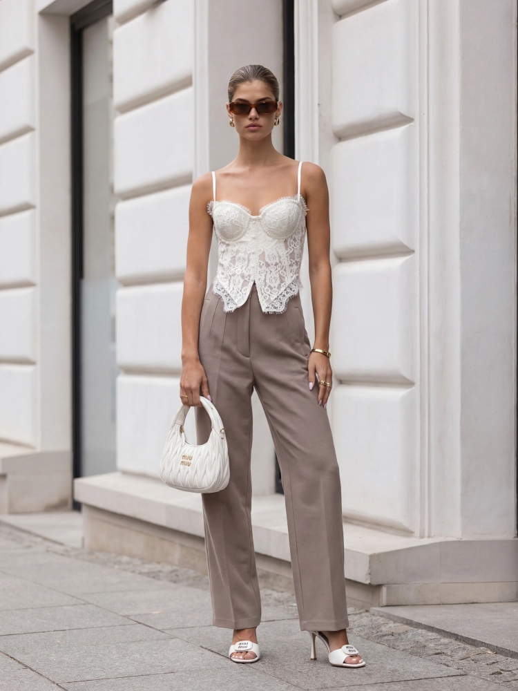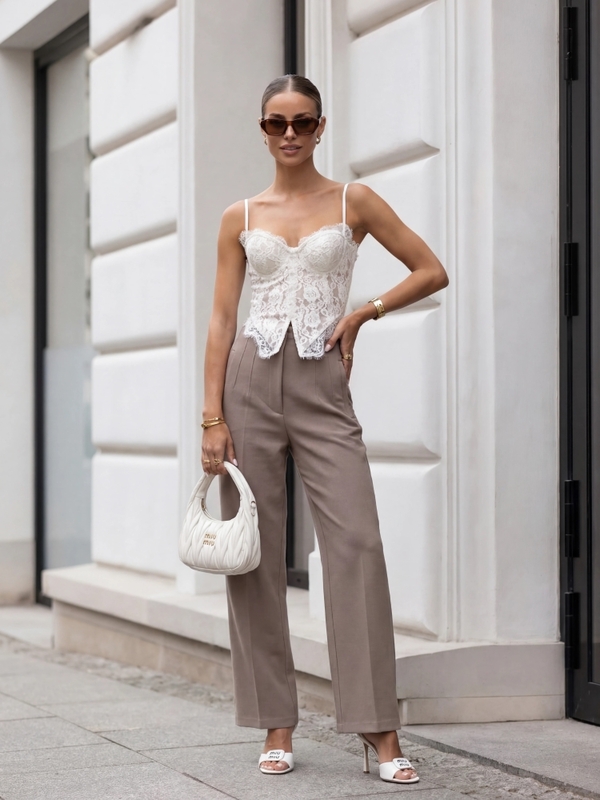 Wyjątkowe spodnie Kelso z wysokim stanem, wykonane z wysokiej jakości materiału. Zapinane na ekspres i wewnętrzny guzik. W pasie znajdują się modelujące przeszycia. Dodatkowym atutem są kieszenie po bokach i krój w kant. Made in Poland. Producent Cocomore. Prezentacja produktu wykorzystuje wizualizacje AI.