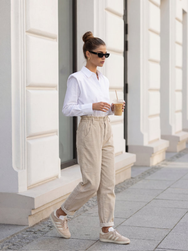 Fantastyczne spodnie, wykonane z wysokiej jakości bawełnianego materiału z dmoieszką elastanu. Ponadczasowy, sztruksowy materiał znakomicie podkreśla ich krój. Wysoki stan, został dopełniony szerokim ściągaczem w talii oraz szlufkami. Zapinane na ekspres i guzik. Po bokach znajdują się praktyczne kieszenie. Prezentacja produktu wykorzystuje wizualizacje AI.
