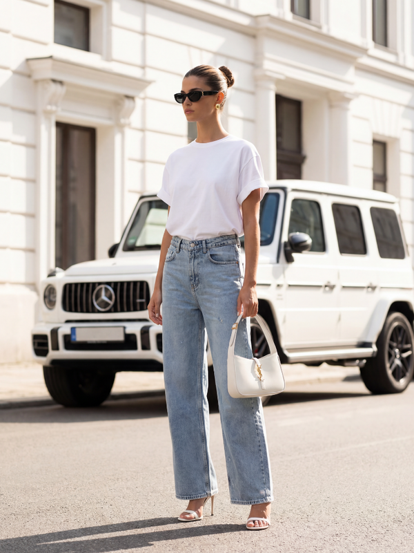 Jeansowe spodnie Louis o zjawiskowym kroju slouchy. Zapinane na praktyczny ekspres i guzik. Posiadają liczne kieszenie, a w talii szlufki. Wysoki stan znakomicie podkreśli talię. Całość dopełniają subtelne przetarcia. W zestawie pasek. Producent Cocomore. Prezentacja produktu wykorzystuje wizualizacje AI.
