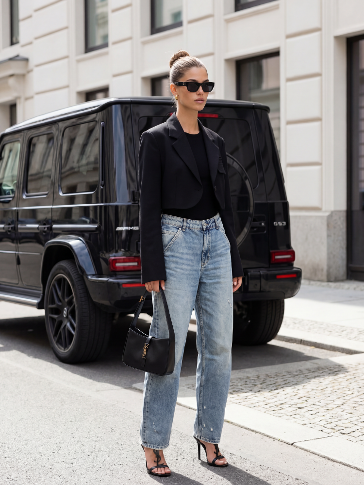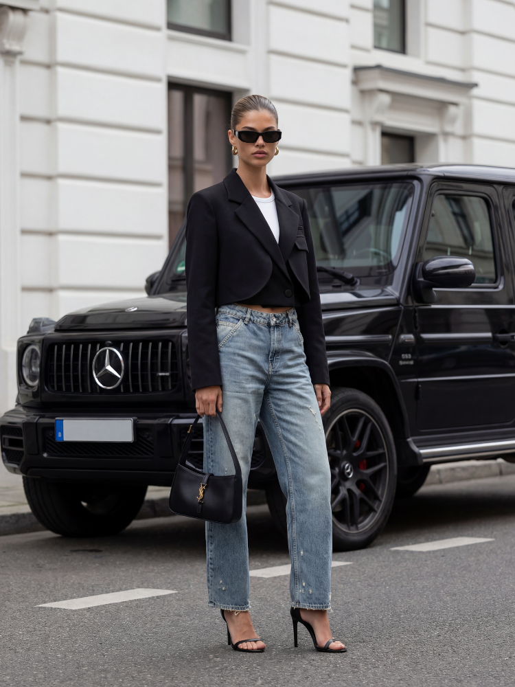 Szerokie, jeansowe spodnie Melvin o kroju skater. Zapinane na praktyczny ekspres i guzik. Posiadają liczne kieszenie, a w talii szlufki. Wysoki stan znakomicie podkreśli talię. Całość dopełniają liczne przetacia.Producent Cocomore. Prezentacja produktu wykorzystuje wizualizacje AI.