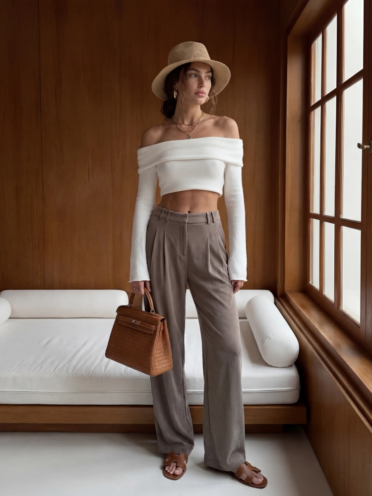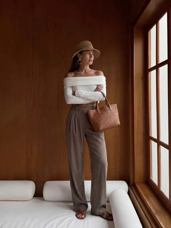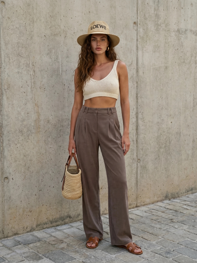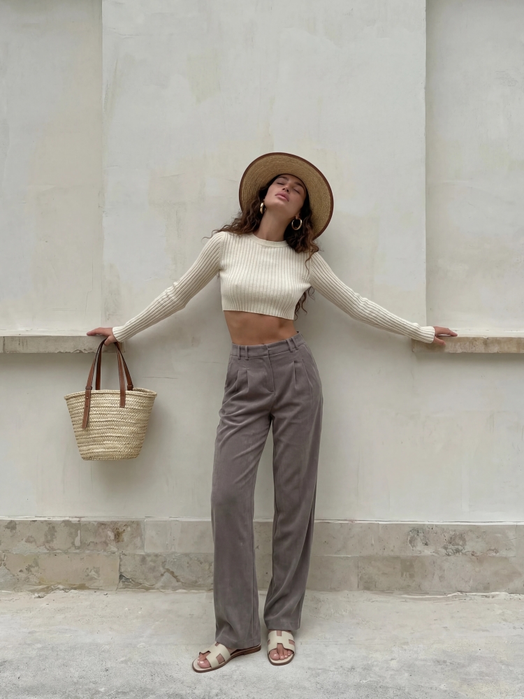 Luźno skrojone spodnie Osborn z prostymi nogawkami. Wysoki stan oraz zakładki wyeksponują talię. Zapinane na ekspres i dwurzędowe guzik, dodatkowo w talii umiejscowione są szlufki. Po bokach znajdują się praktyczne kieszenie. Polski producent Cocomore. Prezentacja produktu wykorzystuje wizualizacje AI.