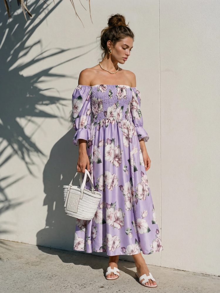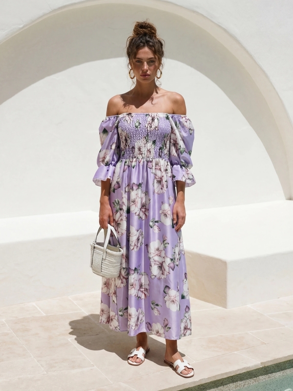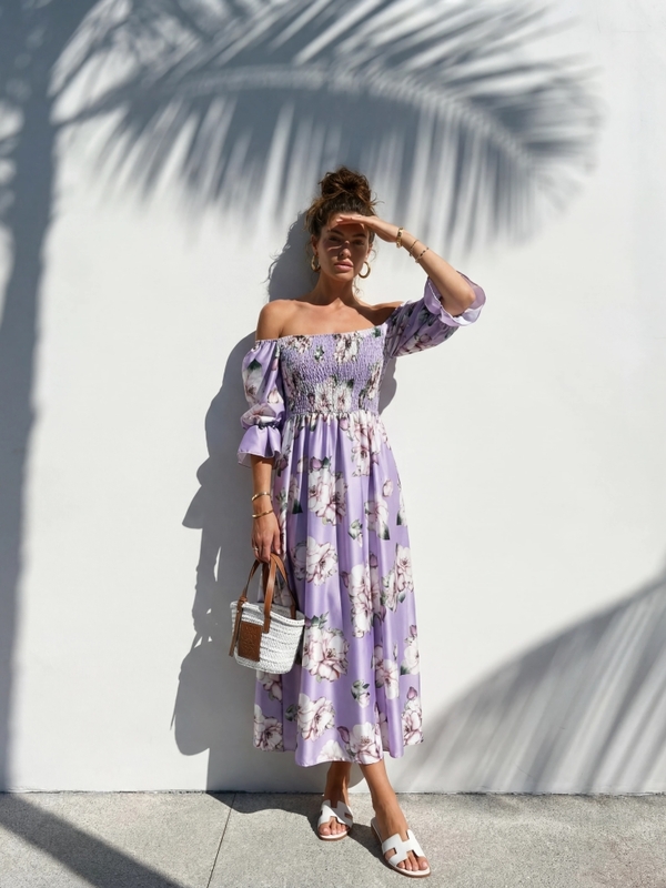 Nowoczesna sukienka Katinga wykonana z wysokiej jakości materiału. Oryginalny fason midi z elastyczną górą, rozkloszowanym dołem i bufiastymi rękawkami, które dodają charakteru. Polski producent Cocomore. Prezentacja produktu wykorzystuje wizualizacje AI.