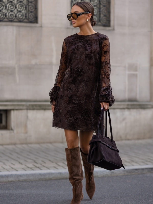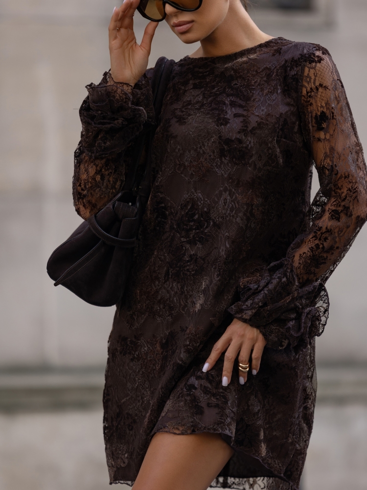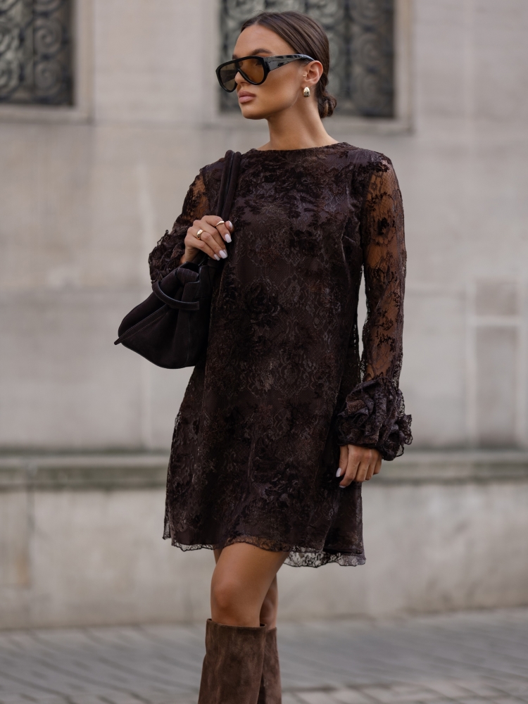 Elegancka sukienka Zaya o luźnym kroju wykonana z efektownej koronki z subtelnym, kwiatowym wzorem. Długie, półprzezroczyste rękawy zakończone romantycznymi falbanami dodają jej kobiecego uroku. Idealna na wieczorne wyjścia, uroczystości lub stylowe kolacje. Polski producent Cocomore.