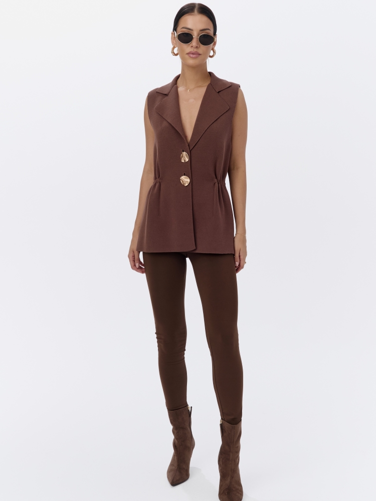 Kamizelka Delphina to modny element garderoby, który nada charakteru każdej stylizacji. Wykonana z wysokiej jakości przędzy. Zapinana na dwurzędowe, ozdobne guziki. Jej prosty krój równoważy marszczenie po bokach. Polski producent Cocomore.