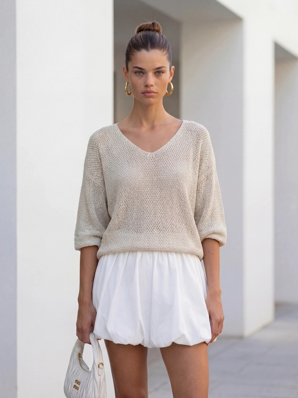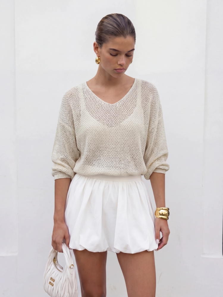 Sweter Aiden to model o luźnym kroju, wykonany z wysokiej jakości przędzy o ażurowym splocie. Na wykończeniach znajdują się subtelne ściągacze, które zapewnią idealne ułożenie. Całość dopełnia kobiecy V-dekolt. Znakomicie spawdzi się jako uzupełnienie wiosenno-letnich stylizacji. Prezentacja produktu wykorzystuje wizualizacje AI.