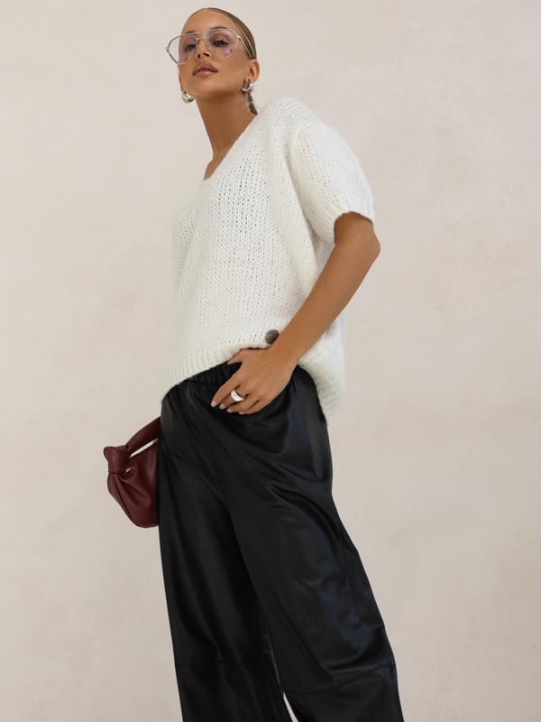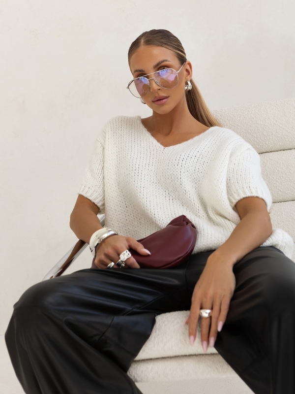 Przepiękny sweterek Elias wykonany z wysokiej jakości przędzy. Szyku dodają bufiaste rękawy oraz ściągacze na wykończeniach. Dodatkowo, dół zdobi naszywka z logo producenta. Całość wieńczy kobiecy V-dekolt. Uniwersalna, niebanalna opcja do wielu stylizacji. Made in Poland.