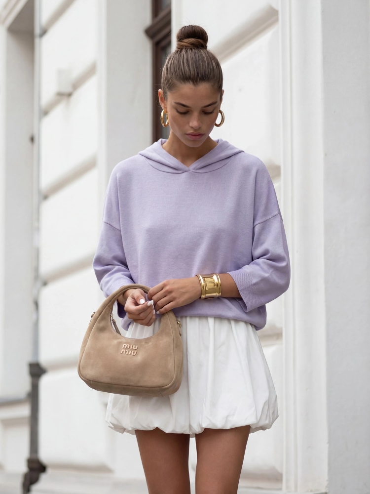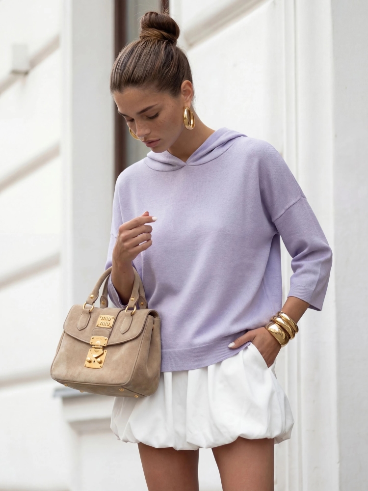 Sweter Ellis to modny i wygodny sweter oversize z krótkim rękawem, ściągaczami na wykończeniach i kapturem. Na dole znajduje się naszywka producenta. Made in Poland.