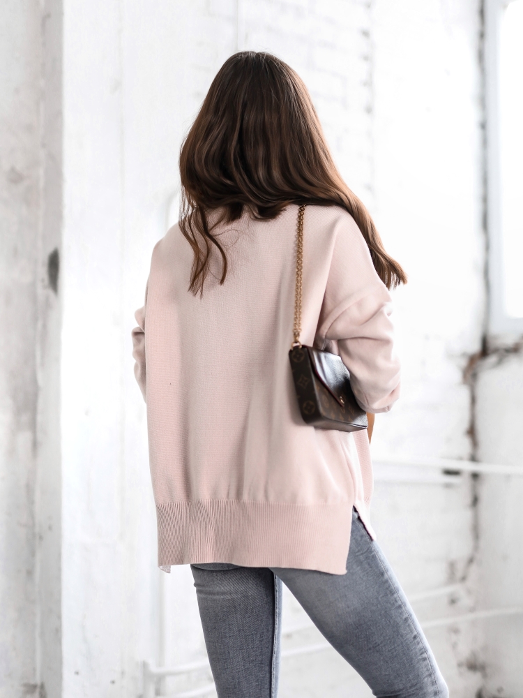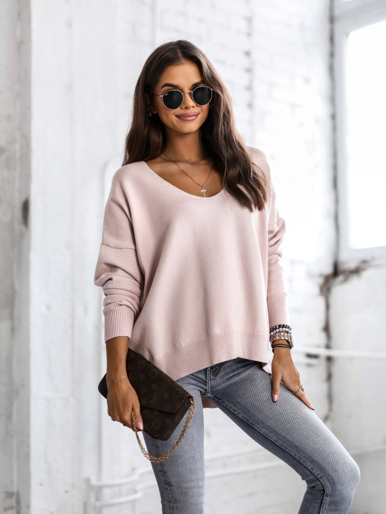 Wyjątkowy, luźny sweterek Flynn, wykonana z wysokiej jakości przędzy. Charakteru dodaje kobiecy V-dekolt. Dodatkowym atutem jest blaszka na boku i delikatne ściągacze na wykończeniach. Made in Poland.