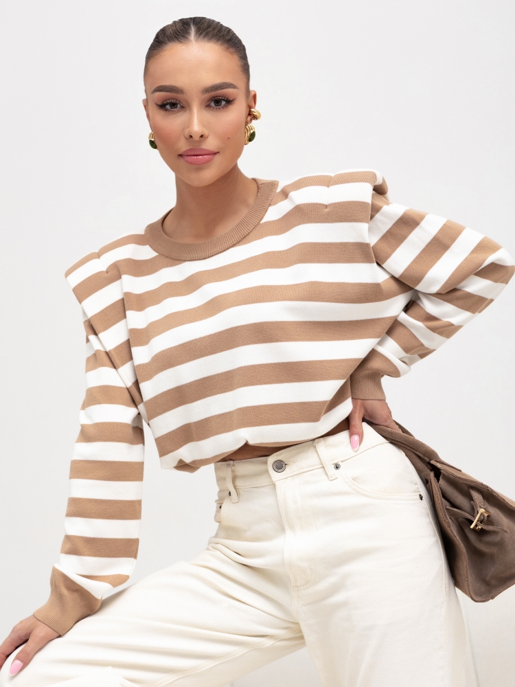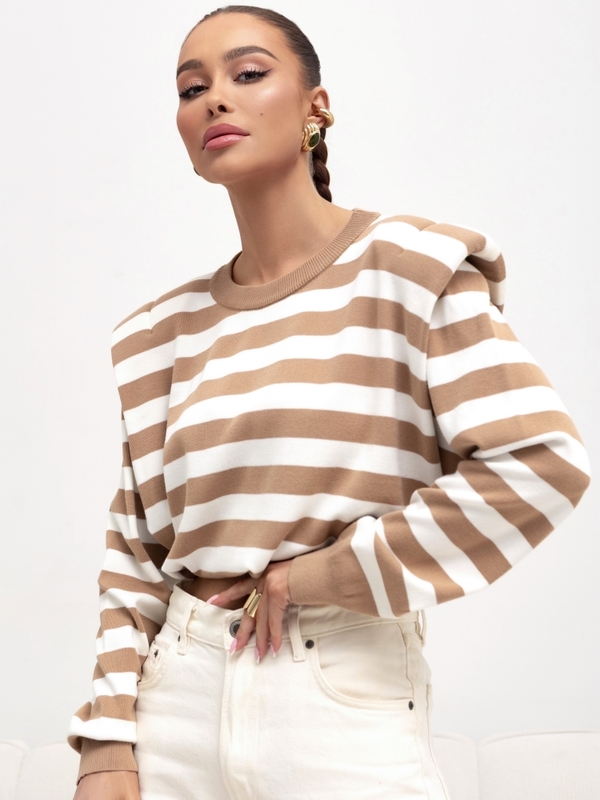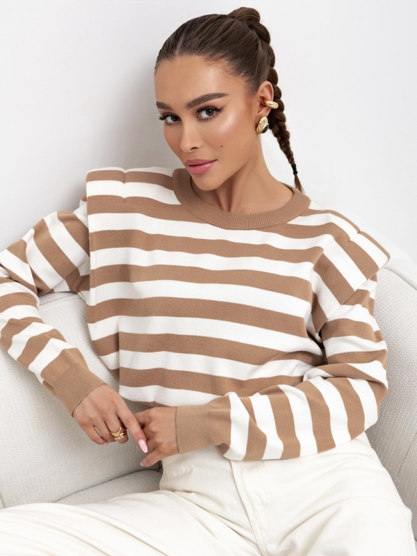 Sweter Garris to krótki sweter z gumką na dole do regulacji. Ma okrągły dekolt, sciągacze na wykończeniach i poduszki w ramiączkach, co dodaje mu wyjątkowego charakteru. Pasiasty wzór nadaje mu wyrazistego i modnego wyglądu. To modny i wygodny wybór na różne okazje, który pozwala wyrazić swoją indywidualność i czuć się stylowo. Producent Cocomore.