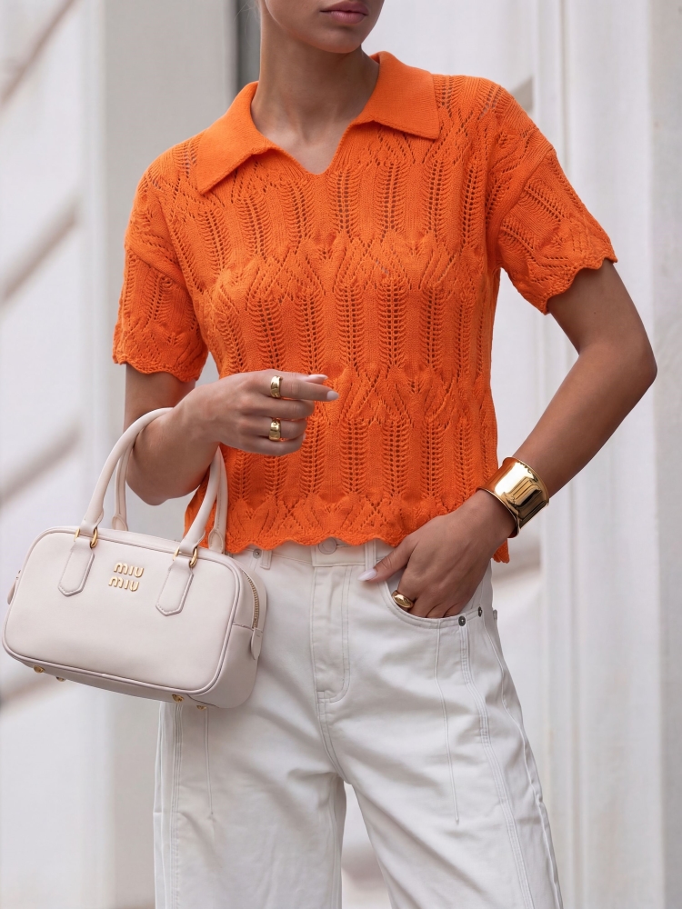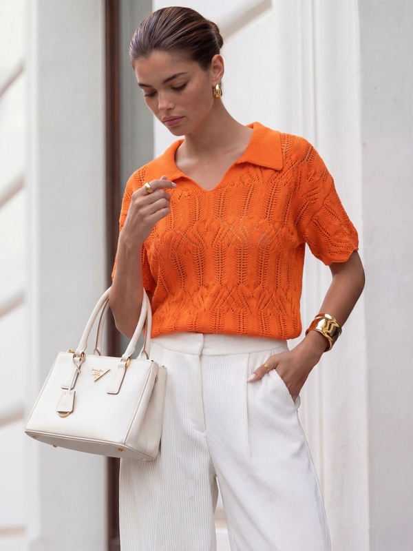 Ponadczasowy sweterek Gregory wykonany z wysokiej jakości przędzy w wyjątkowe, ażurowe wzory. Szyku dodają nieregularne wykończenia oraz krój polo. Uniwersalna, niebanalna opcja do wielu stylizacji. Made in Poland. Producent Cocomore. Prezentacja produktu wykorzystuje wizualizacje AI.
