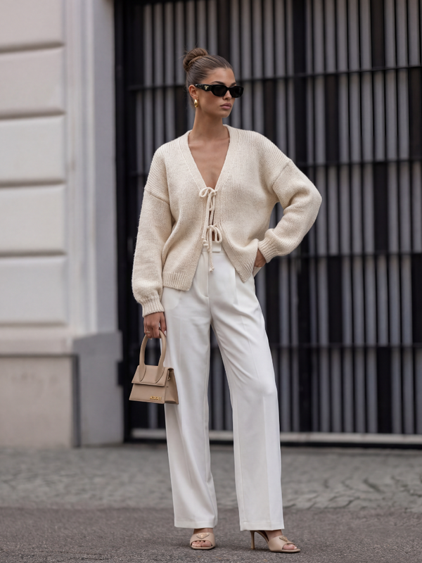 Sweter Herald to kardigan o krótkim kroju zdobiony wiązaniami z przodu. Kobiecy V-dekolt oraz ściągacze na wykończeniach wyeksponują atuty sylwetki. Całość wieńczą szerokie rękawy, zakończone ściągaczami. Polski producent Cocomore.  Prezentacja produktu wykorzystuje wizualizacje AI.