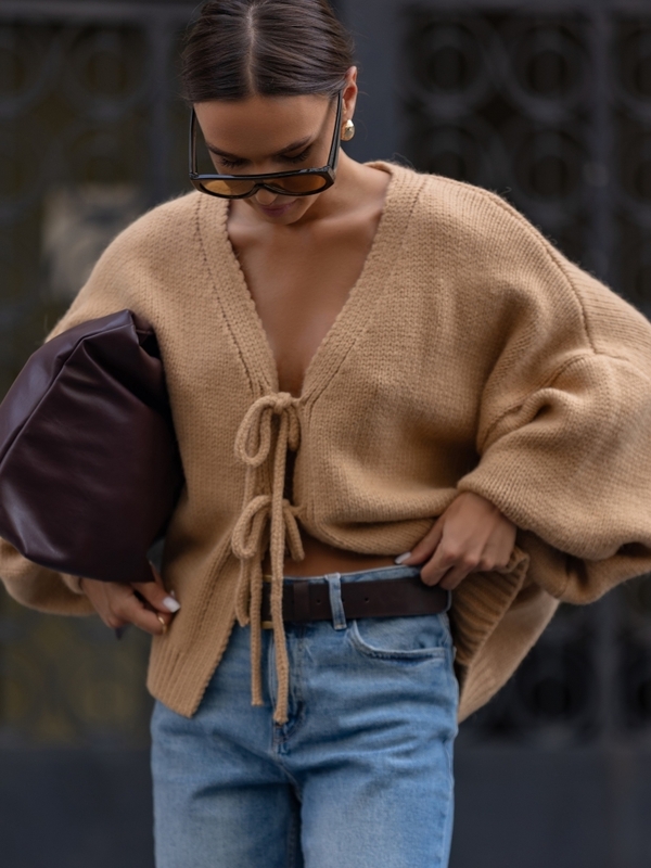 Sweter Herald to kardigan o krótkim kroju zdobiony wiązaniami z przodu. Kobiecy V-dekolt oraz ściągacze na wykończeniach wyeksponują atuty sylwetki. Całość wieńczą szerokie rękawy, zakończone ściągaczami. Polski producent Cocomore.