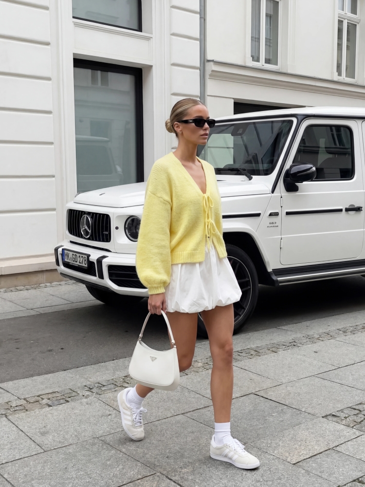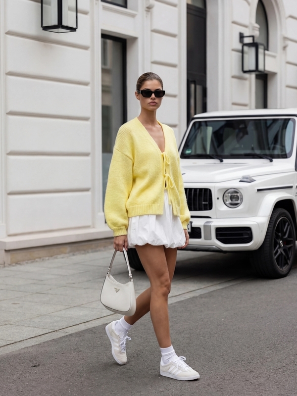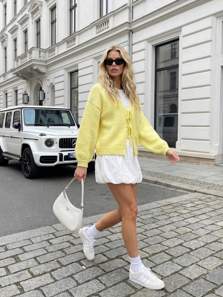 Sweter Herald to kardigan o krótkim kroju zdobiony wiązaniami z przodu. Kobiecy V-dekolt oraz ściągacze na wykończeniach wyeksponują atuty sylwetki. Całość wieńczą szerokie rękawy, zakończone ściągaczami. Polski producent Cocomore.  Prezentacja produktu wykorzystuje wizualizacje AI.