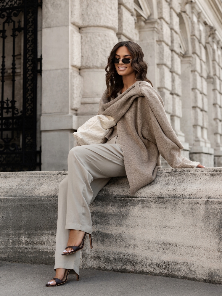 Genialny sweter Kael to model o niepowtarzalnym fasonie. Luźny krój równoważy zapięcie na jeden guzik, całość dopełniają szerokie rękawy. Jego głównym aspektem jest przyszyty szal z możliwością upięcia pod szyją. Polski producent Cocomore.