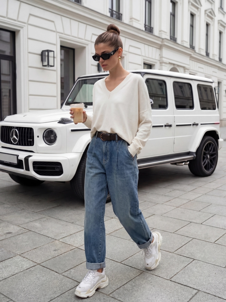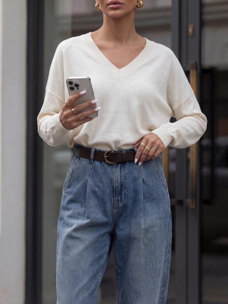 Ponadczasowy sweterek Kayden, wykonany z wysokiej jakości przędzy z głębokim V-dekoltem. Świetnie skomponuje się z każdą stylizacją. Dodatkowym atutem są ściągacze na wykończeniach oraz luźny krój. Uroku dodają mu subtelne rozcięcia po bokach. Made in Poland. Producent Yarn Studio. Prezentacja produktu wykorzystuje wizualizacje AI.